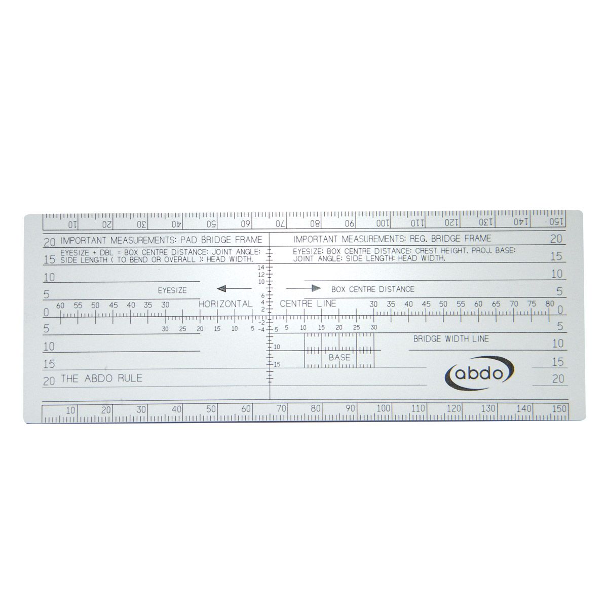 A.B.D.O Rule accurately measures: Interpupillary distance, boxed lens size, DBL, boced centre distance, crest height, bridge projection, DBR, bridge height and width.