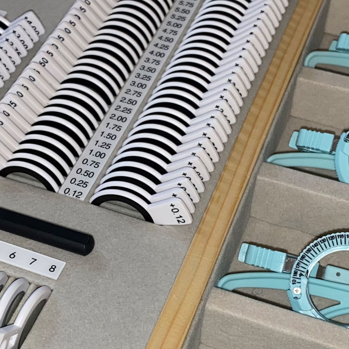 Paediatric trial lens set. Contains small aperture trial lenses and a total of 5 different sized trial frames. Ranging from PD's of 44-52 mm. Lenses from 0.125D to 20.00D. Prisms from 1/2 to 8 base, a range of filters such as Pinhole and a cross-cyl.